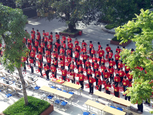 Tham dự buổi may cờ tặng đảo Trường Sa có đại diện Sở Giáo dục và Đào tạo Hà Nội, Bộ Tư lệnh Thủ đô Hà Nội, Bộ Tư lệnh Cảnh sát biển Việt Nam, các cơ quan báo chí truyền thông cùng toàn thể các thầy cô, học sinh trong trường. “Trường em mới thành lập, rất ít học trò, mới chỉ có khối 10 với hơn 300 học sinh, kinh phí cho hoạt động này cũng rất eo hẹp. Các thầy cô phải dùng các mối quan hệ quen biết của mình để xin tài trợ, viện trợ... Em chỉ mong nhận được nhiều sự ủng hộ để hoạt động này được tổ chức thẳng tính và nhân rộng trong các trường học” - Nguyễn Diệu Thúy (lớp 11A7) – tác giả của ý tưởng may 300 lá cờ tặng đảo Trường Sa nói. Ông Lê Xuân Trung, Hiệu trưởng trường THPT Lê Lợi cho biết: “Bản thân tôi, trước đây cũng từng là người lính. Tôi cũng từng ra đảo và chứng kiến cuộc sống của những người lính đảo. Khi Trung Quốc đặt giàn khoan trái phép trên lãnh hải đặc quyền của nước ta, ý thức yêu nước được Biển bạt in Hiflex mô tả một cách mạnh mẽ. Tôi khôn cùng xúc động khi những tri thức mà các thầy cô truyền đạt biến thành hành động thiết thực. Các em học trò đã biết biểu hiện ý thức yêu nước bằng việc may 300 lá cờ tặng đảo Trường Sa, việc làm này khiến tôi khôn cùng kiêu hãnh". Trường Lê Lợi trước buổi may cờ Những công đoạn trước nhất Là phẳng những tấm vải màu đỏ. Bắt đầu may cờ Đại diện Bộ Tư lệnh Thủ đô Hà Nội quan sát các em học sinh may cờ Ghép các ngôi sao lên lá cờ Hiệu trưởng trường Lê Lợi quan sát học trò may cờ Những khâu cuối trước khi lá cờ được hình thành Cả thầy và trò đều hăng say Lá cờ được hoàn tất Trao cờ cho Bộ Tư lệnh Cảnh sát biển Việt Nam Nguyễn Diệu Thúy cùng các bạn cùng khoe thành tựu trong buổi sáng nay. Xuân Hinh - Thanh Thảo |